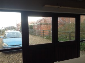 So something had to be done. After a lot of thought, I’ve gone for single garage doors, with windows in the top, and windows down the side. Light is flooding in, and it is actually warm now. As this is side of the house faces north, that light is the ideal sort for a studio.