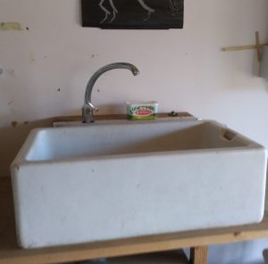 But not any more. My chum Ruby stood in the studio one day and said “What you need in here is a sink. Do you want one of my old Belfast ones?” So in due course, she brought it round. I chiselled out the compost from the overflow, and Stan has plumbed it in for me.