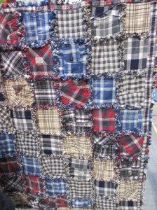 The first picture shows that, while sewing together squares of old shirts might sound ordinary, thinking about using the raw edges as a feature can liven things up considerably.