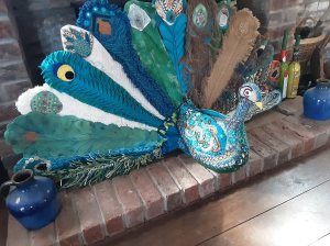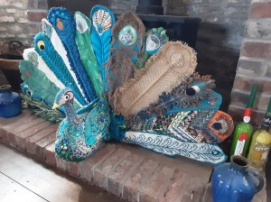 I have finally finished my peacock fire screen. He isn’t quite as I had planned, but then I didn’t think it through properly before I started.