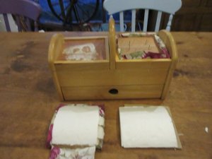 I found an old sewing box in a second hand shop a while ago. It was a bit battered, and in need of some tlc. The fabric covered top seemed the obvious place to put pins, but it was very hard, and not easy to push pins in. So I took it apart to see what happened.