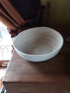 The result was this fruit bowl size piece. I wasn’t really planning to make anything in particular, I just wanted to know whether I could do it, and how far the rope would go. I like the basket, but it occurred to me that what I could do with was a yarn bowl, to keep balls under control while I’m warping the loom.